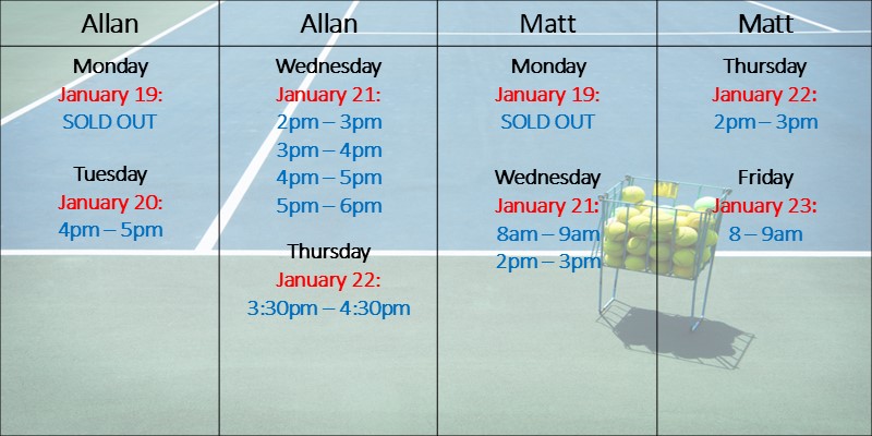 All of our private tennis lesson date and time options are listed below.
