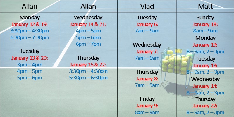 December 2025 & January 2026 Private Lesson Availability Schedule
